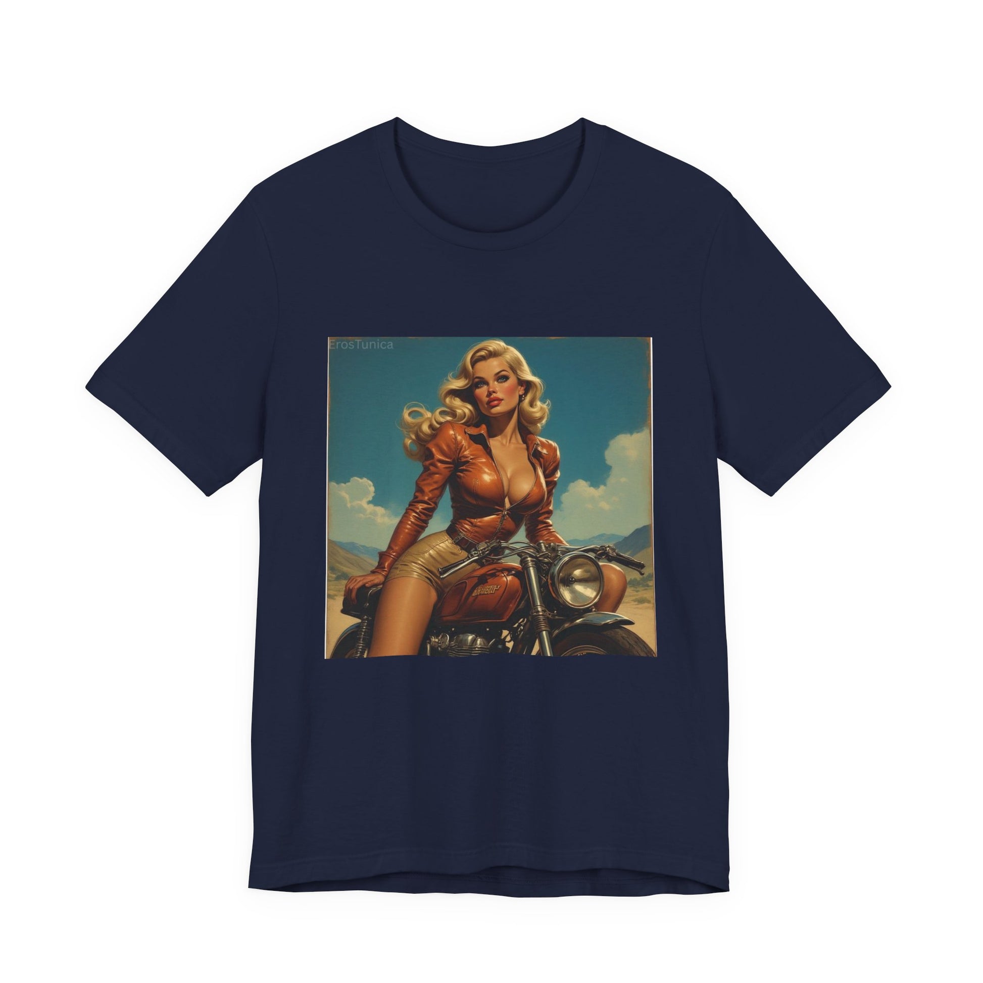 Grit Glam and a little Gasoline, the great American pin up rides again. This lightweight jersey tee carries vintage pinup energy with modern comfort. The central artwork — a sunlit, retro-styled rider posed on a motorcycle — feels like a snapshot from a summer roadside moment: warm skies, leather gleam, and confident attitude. Wear it to add an unexpected nostalgic edge to a casual outfit or layered under a jacket when you want your style to speak with a wink. The slim retail fit and crew neckline keep the silhouette clean so the art remains the focal point, while breathable Airlume cotton makes all-day wear effortless. It’s for people who love classic Americana, open roads, and bold graphic statements that read like a short story every time you put the shirt on.