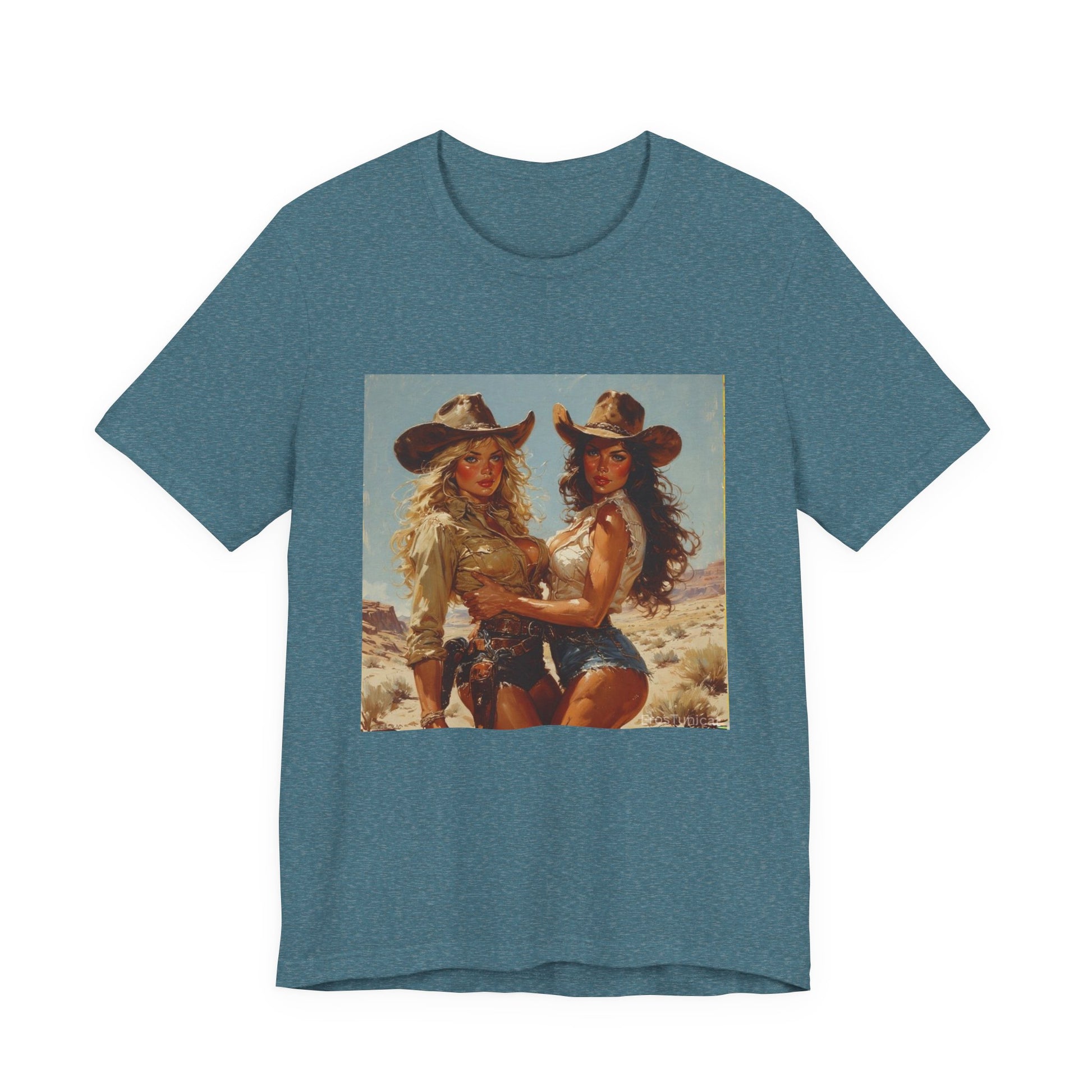 This lightweight tee carries a sun-drenched, Western-roadtrip mood. The soft Airlume cotton feels breathable against skin while the square photographic print brings a vintage Americana scene to the front—cowgirl hats, denim, and a desert scene backdrop. Wear it on long drives, at small summer gatherings, or when you want an easy layer that looks lived-in and effortless. The crew neck and retail fit keep the silhouette clean so the image stays the focal point. It pairs with high-waisted denim, worn-in boots, and a leather belt for a casually nostalgic look that reads both playful and confident.