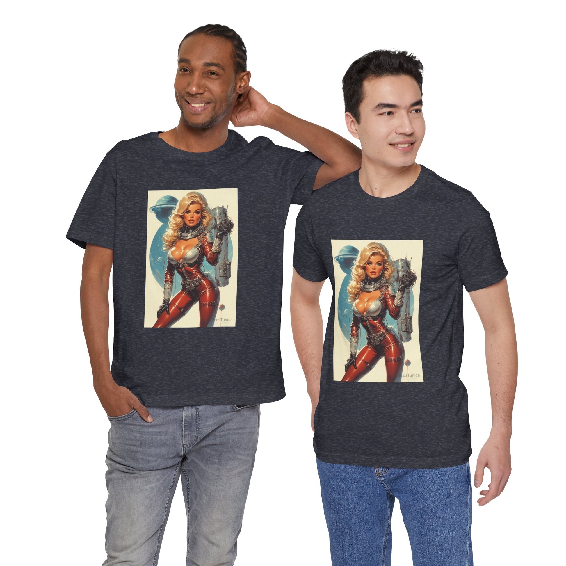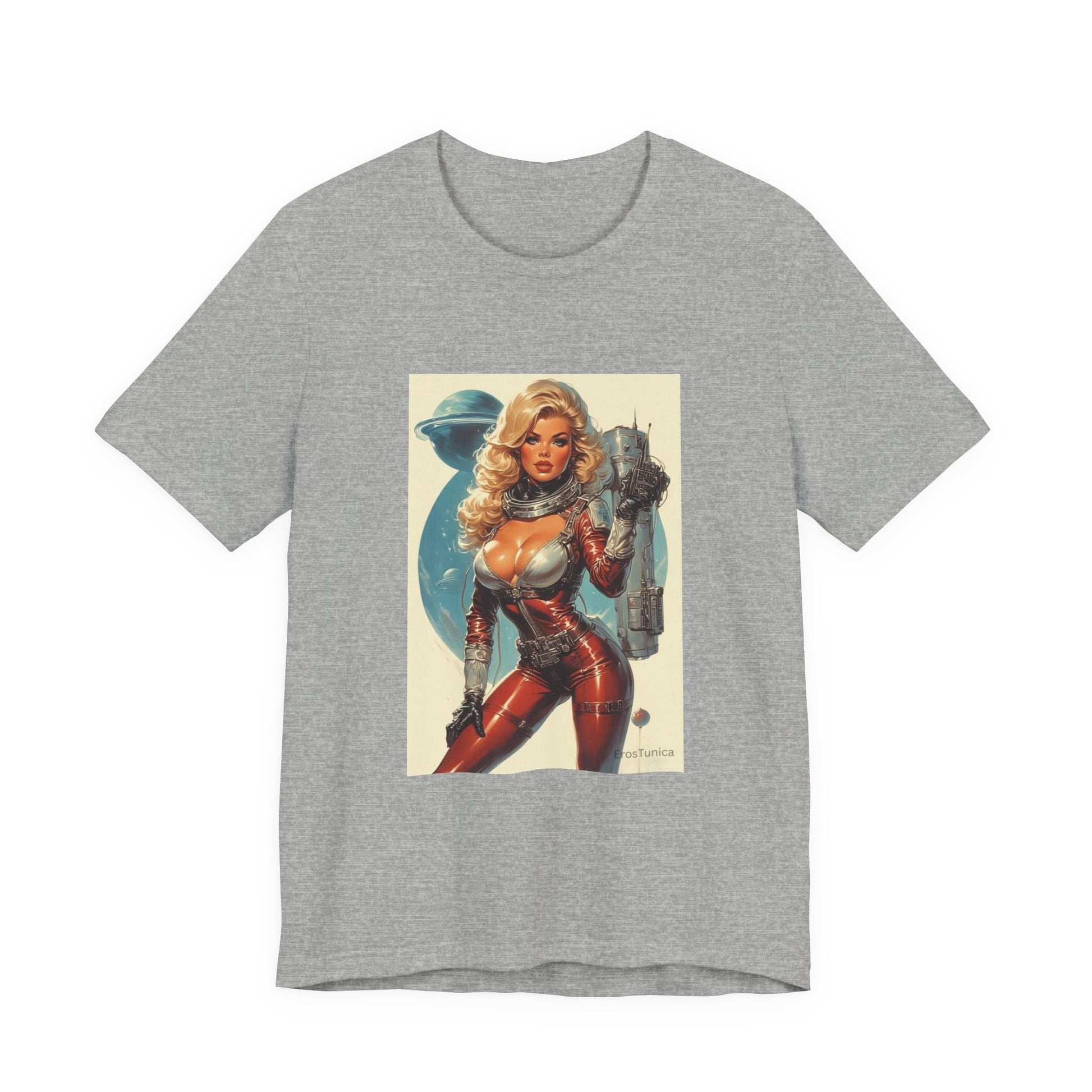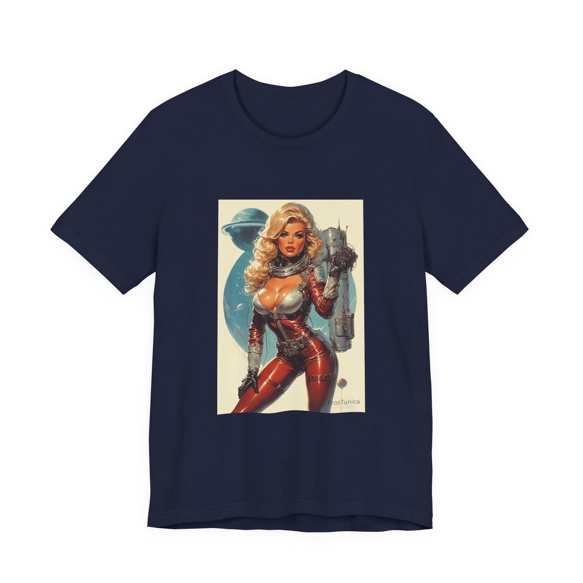A retro T-Shirt featuring a blonde space girl in a multi-colored space suit, giving off a nostalgic and whimsical vibe. Perfect for space enthusiasts or lovers of retro designs. Ideal for casual wear, cosplay events, sci-fi themed parties, and space-related holidays.